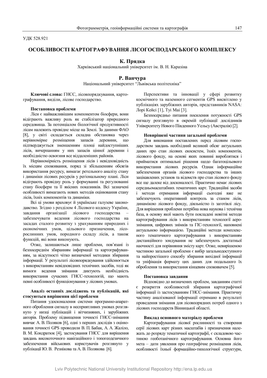 Прядка К. Особливості картографування лісогосподарського комплексу / К. Прядка, Р. Ванчура // Сучасні досягнення геодезичної науки та виробництва. — Львів, 2017. — Том 1 (33). — С. 147–151.