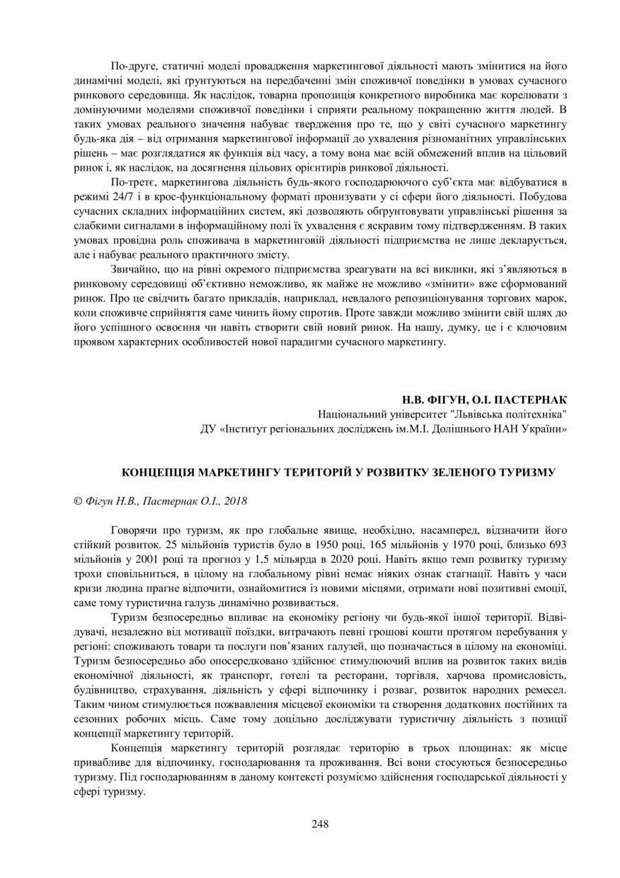 Фігун Н. В. Концепція маркетингу територій у розвитку зеленого туризму / Н. В. Фігун, О. І. Пастернак // Маркетинг та логістика в системі менеджменту : тези доповідей XІI Міжнародної науково-практичної конференції, 25–27 жовтня 2018 року, Львів. — Львів : Видавництво Львівської політехніки, 2018. — С. 248–250.