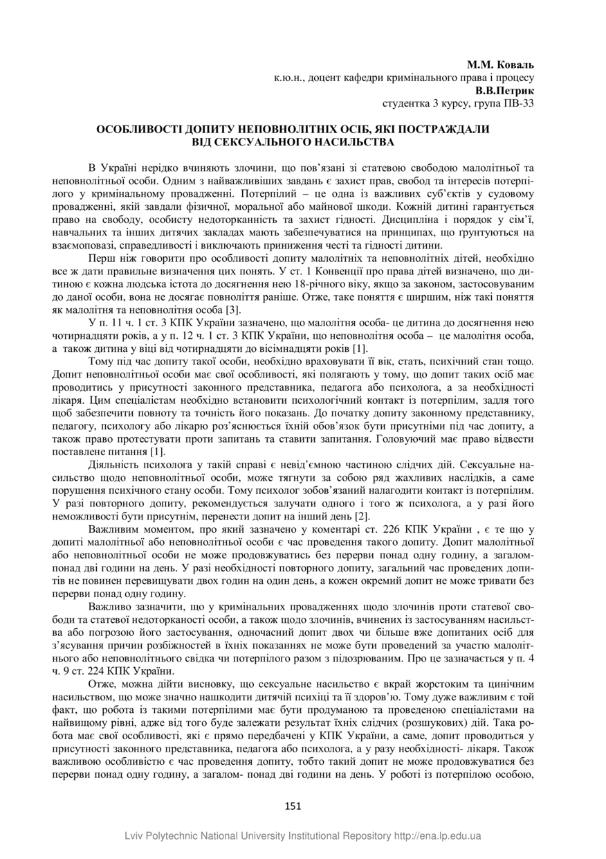 | dc.relation.referencesen | 2. Mozghova V. Taktyko-psykholohichni osoblyvosti dopytu nepovnolitnikh, yaki postrazhdaly vid seksualnoho nasylstva, V. Mozghova, Naukovyi chasopys Natsionalnoi akademii prokuratury Ukrainy. 2015. No 4. P. 94-104. | |