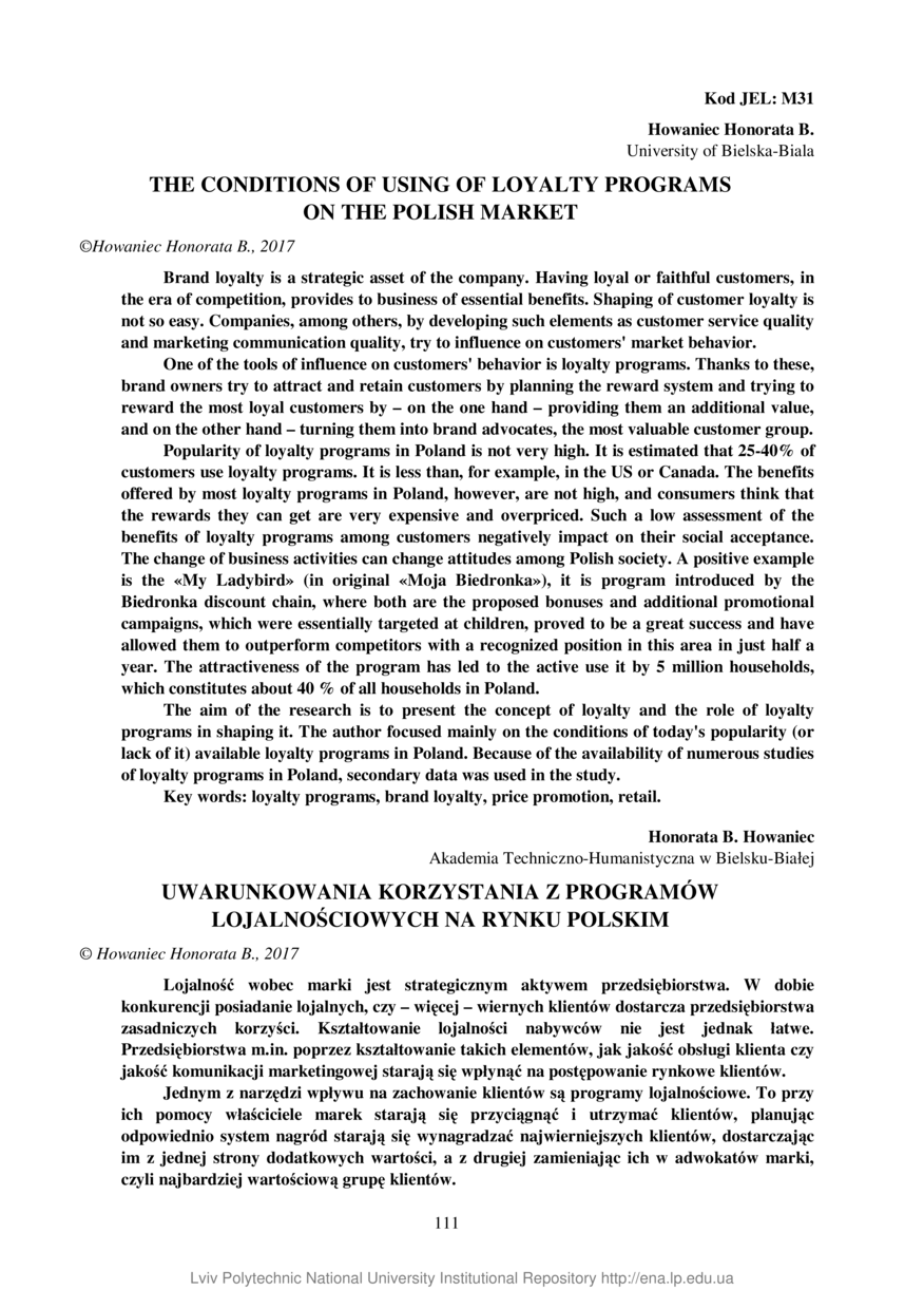 Howaniec Honorata B. The conditions of using of loyalty programs on the Polish market / Howaniec Honorata B. // Вісник Національного університету «Львівська політехніка». Серія: Проблеми економіки та управління. — Львів : Видавництво Львівської політехніки, 2017. — № 873. — С. 111–118.