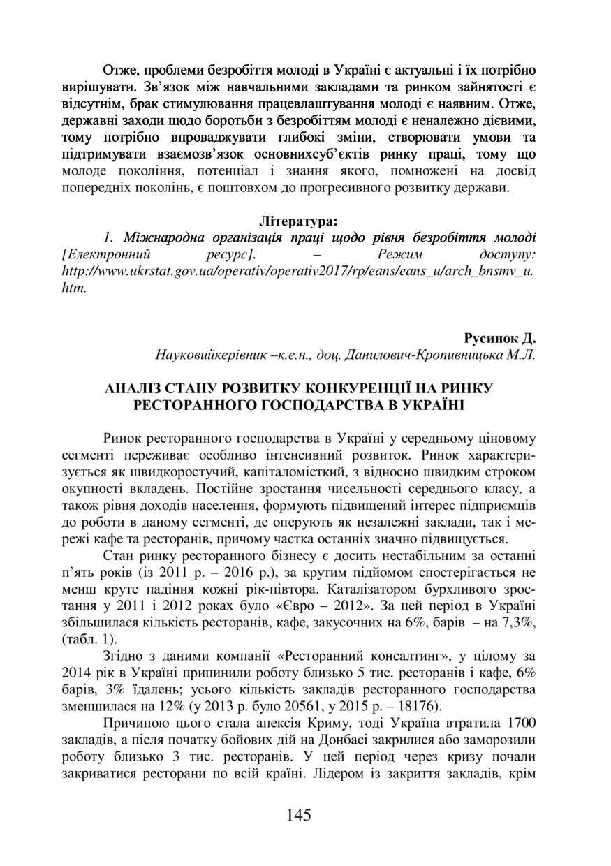 Русинок Д. Аналіз стану розвитку конкуренції на ринку ресторанного господарства в Україні / Д. Русинок, М. Л. Данилович-Кропивницька // 76-та Студентська науково-технічна конференція. Секція "Публічне управління та адміністрування" : збірник тез доповідей, 7 листопада 2018 року, Львів. — Львів : Видавництво Львівської політехніки, 2018. — С. 145–148.