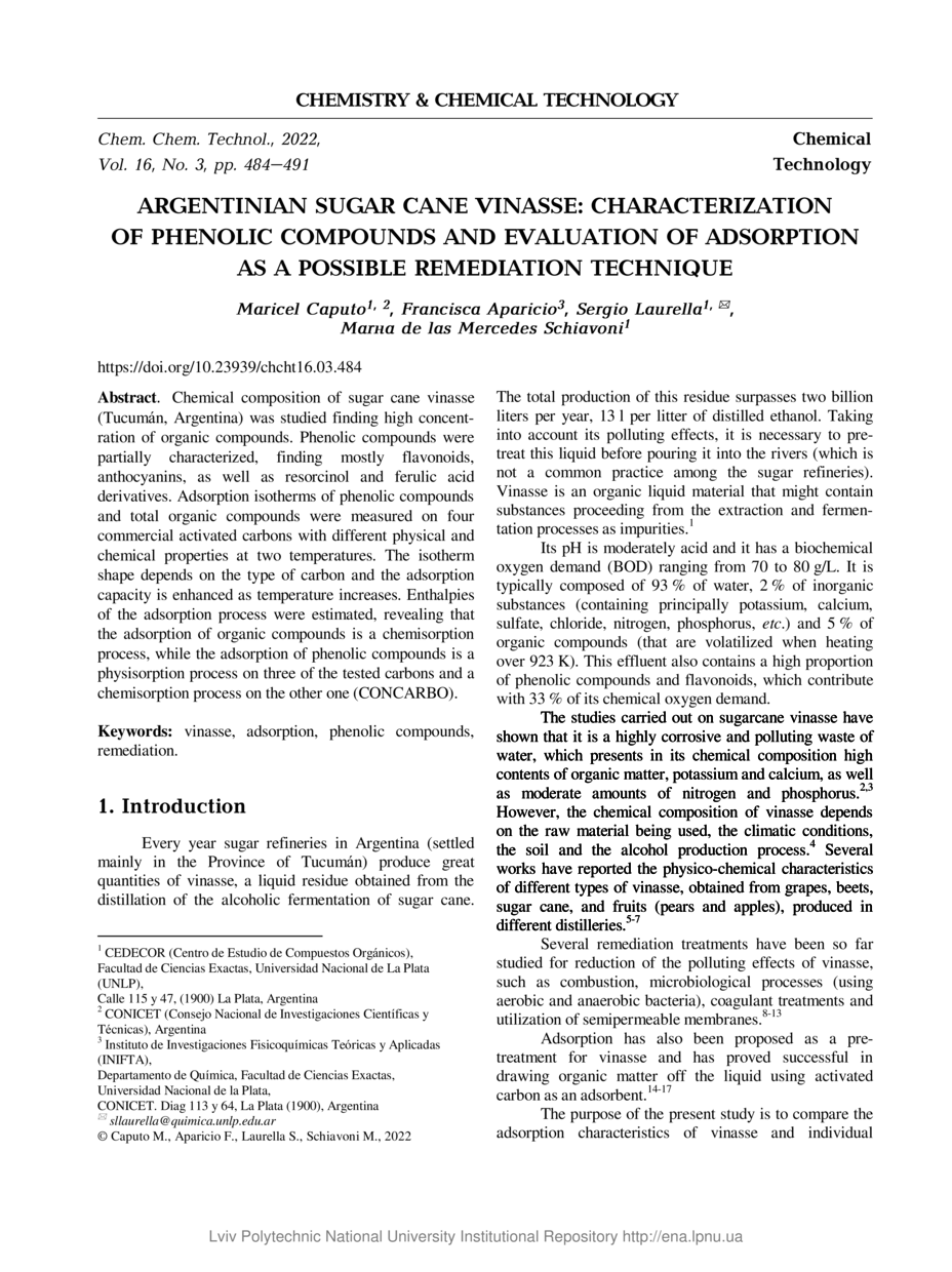 Argentinian Sugar Cane Vinasse: Characterization of Phenolic Compounds and Evaluation of Adsorption as a Possible Remediation Technique / Maricel Caputo, Francisca Aparicio, Sergio Laurella, María de las Mercedes Schiavoni // Chemistry & Chemical Technology. — Lviv : Lviv Politechnic Publishing House, 2022. — Vol 16. — No 3. — P. 484–491.