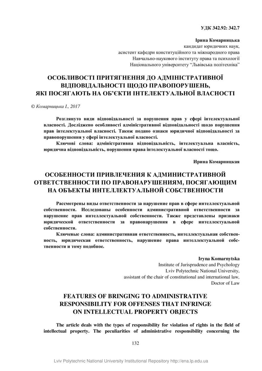 Комарницька І. Особливості притягнення до адміністративної відповідальності щодо правопорушень, які посягають на об’єкти інтелектуальної власності / Ірина Комарницька // Вісник Національного університету "Львівська політехніка". Серія: Юридичні науки. — Львів : Видавництво Львівської політехніки, 2017. — № 884. — С. 132–137.
