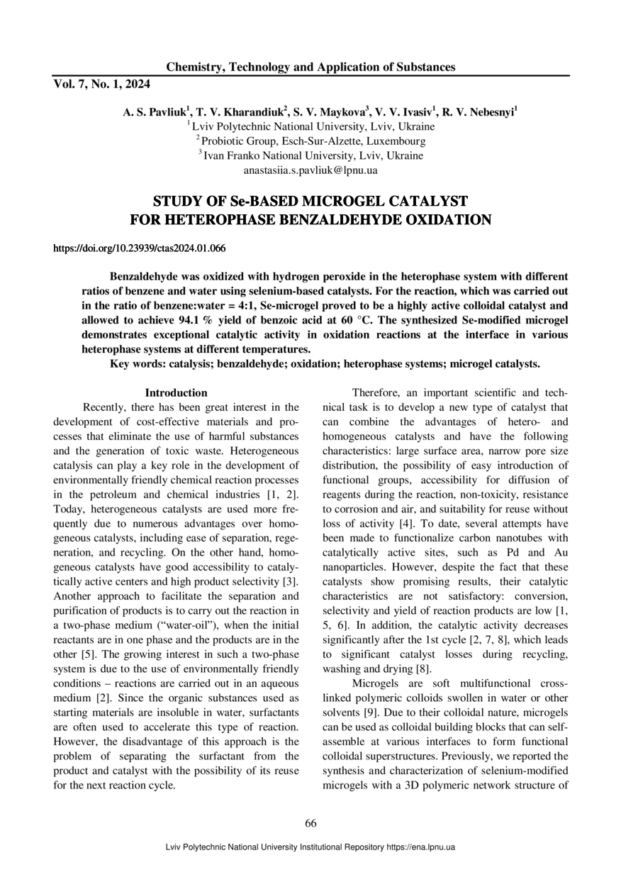 Study of Se-based microgel catalyst for heterophase benzaldehyde oxidation / A. S. Pavliuk, T. V. Kharandiuk, S. V. Maykova, V. V. Ivasiv, R. V. Nebesnyi // Chemistry, Technology and Application of Substances. — Lviv : Lviv Politechnic Publishing House, 2024. — Vol 1. — No 7. — P. 66–70.