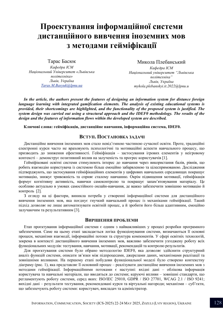 Басюк Т. Проектування інформаційної системи дистанційного вивчення іноземних мов з методами гейміфікації / Тарас Басюк, Микола Плебанський // Інформація, комунікація, суспільство 2025: ICS-2025 : матеріали XIV Міжнародної наукової конференції, 22-24 травня 2025 року, Львів. — Львів : Видавництво Львівської політехніки, 2025. — С. 128–129. — (Інформаційні та комунікаційні технології в соціальних середовищах інтернету).