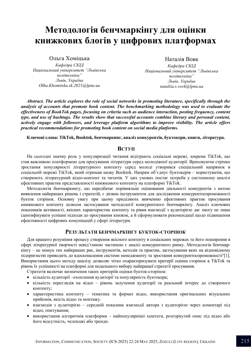 | dc.identifier.citationen | Khomitska O. Metodolohiia benchmarkinhu dlia otsinky knyzhkovykh blohiv u tsyfrovykh platformakh / Olha Khomitska, Nataliia Vovk // Informatsiia, komunikatsiia, suspilstvo 2025: ICS-2025 : materialy XIV Mizhnarodnoi naukovoi konferentsii, 22-24 travnia 2025 roku, Lviv. — Lviv : Lviv Politechnic Publishing House, 2025. — P. 215–216. — (Sotsialni komunikatsii). | |
