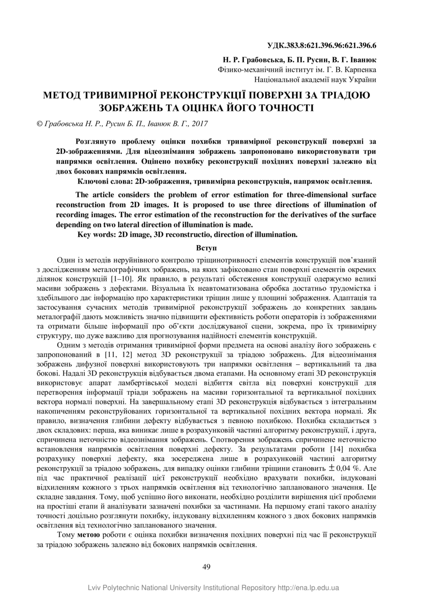 Грабовська Н. Р. Метод тривимірної реконструкції поверхні за тріадою зображень та оцінка його точності / Н. Р. Грабовська, Б. П. Русин, В. Г. Іванюк // Вісник Національного університету «Львівська політехніка». Серія: Інформаційні системи та мережі. — Львів : Видавництво Львівської політехніки, 2017. — № 872. — С. 49–61.