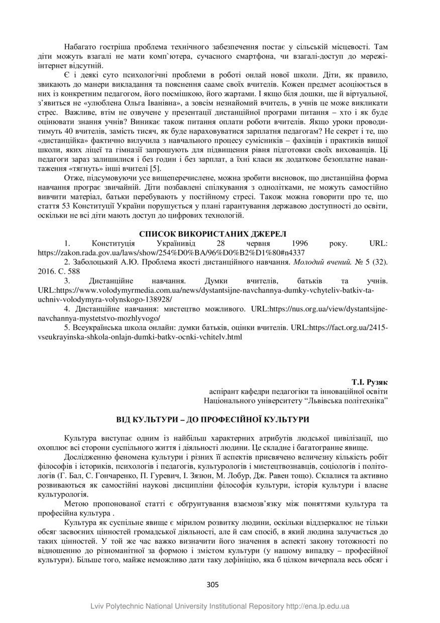 Рузяк Т. І. Від культури – до професійної культури / Т. І. Рузяк // Захист прав і свобод людини та громадянина в умовах формування правової держави : збірник тез ІХ Всеукраїнської науково-практичної конференції, 30 травня 2020 року, Львів. — Львів : Видавництво Львівської політехніки, 2020. — С. 305–306. — (Свобода ЗМІ і свобода слова та психологічні аспекти в контексті захисту прав і свобод людини та громадянина в умовах формування правової держави).