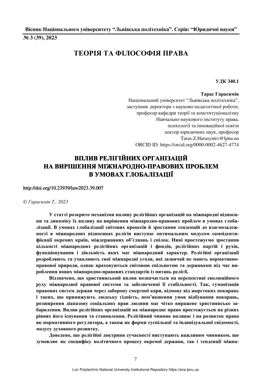 Гарасимів Т. Вплив релігійних організацій на вирішення міжнародно-правових проблем в умовах глобалізаціЇ / Тарас Гарасимів // Вісник Національного університету “Львівська політехніка”. Серія: “Юридичні науки”. — Львів : Видавництво Львівської політехніки, 2023. — № 3 (39). — С. 7–12.