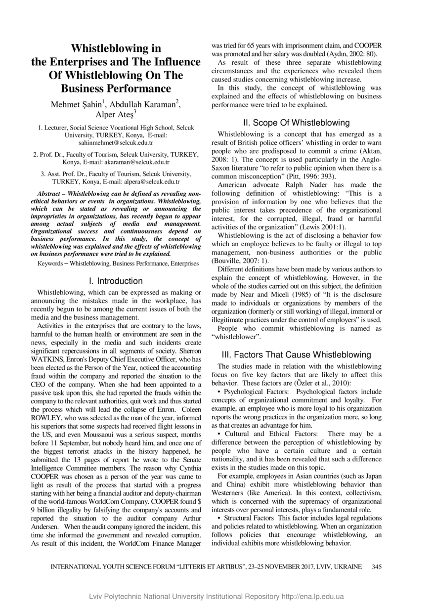 | dc.identifier.citation | Şahin M. Whistleblowing in the enterprises and the influence of whistleblowing on the business performance / Mehmet Şahin, Abdullah Karaman, Alper Ateş // Litteris et Artibus : proceedings, 23–25 November, 2017. — Lviv : Lviv Polytechnic Publishing House, 2017. — P. 345–347. — (6th International academic conference «Economics & management 2017» (EM-2017)). | |