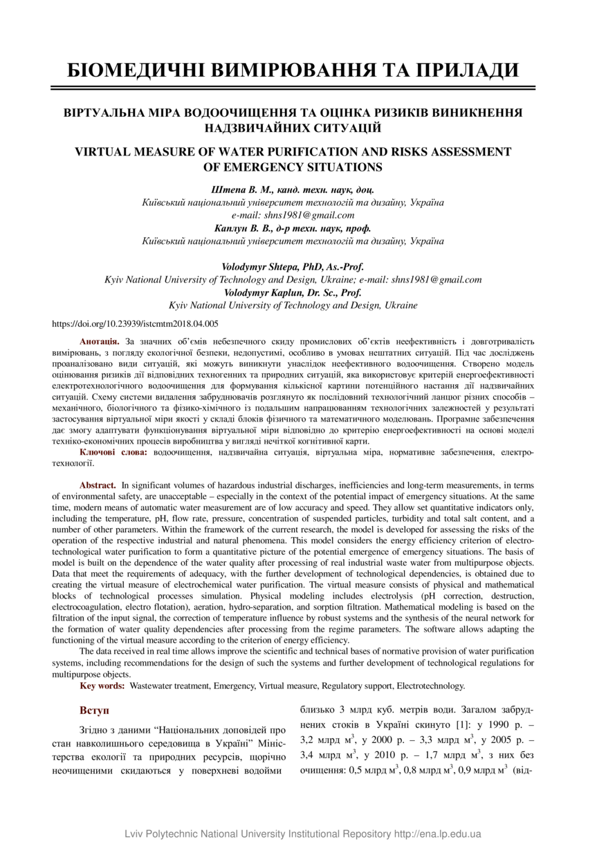 Штепа В. М. Віртуальна міра водоочищення та оцінка ризиків виникнення надзвичайних ситуацій / В. М. Штепа, В. В. Каплун // Вимірювальна техніка та метрологія : міжвідомчий науково-технічний збірник. — Львів : Видавництво Львівської політехніки, 2018. — Том 79. — № 4. — С. 5–11.