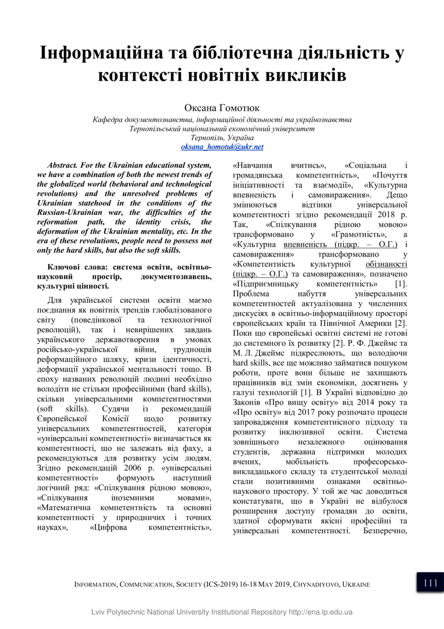 | dc.identifier.citationen | Homotiuk O. Informatsiina ta bibliotechna diialnist u konteksti novitnikh vyklykiv / Oksana Homotiuk // Information, Communication, Society 2019 : proceedings of the 8th International Academic ConferenceICS-2019, 16-18 travnia 2019 roku, Chynadiievo. — Lviv : Lviv Politechnic Publishing House, 2019. — P. 111–112. — (Bibliotechna, arkhivna ta muzeina diialnist v umovakh rozvytku informatsiinoho suspilstva). | |
