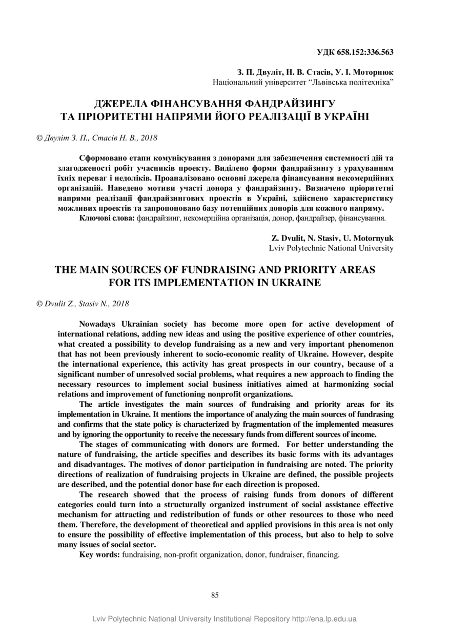 Двуліт З. П. Джерела фінансування фандрайзингу та пріоритетні напрями його реалізації в Україні / З. П. Двуліт, Н. В. Стасів, У. І. Моторнюк // Вісник Національного університету “Львівська політехніка”. Серія: Менеджмент та підприємництво в Україні: етапи становлення і проблеми розвитку. — Львів : Видавництво Львівської політехніки, 2018. — № 899. — С. 85–90.