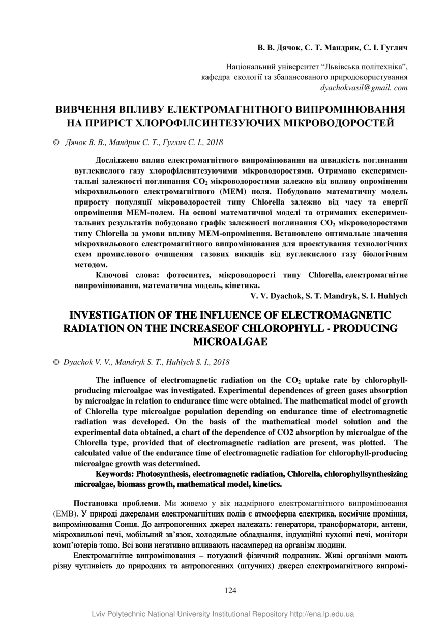 | dc.identifier.citation | Дячок В. В. Вивчення впливу електромагнітного випромінювання на приріст хлорофілсинтезуючих мікроводоростей / В. В. Дячок, С. Т. Мандрик, С. І. Гуглич // Chemistry, Technology and Application of Substances. — Lviv : Lviv Politechnic Publishing House, 2018. — Том 1. — № 2. — С. 124–131. | |