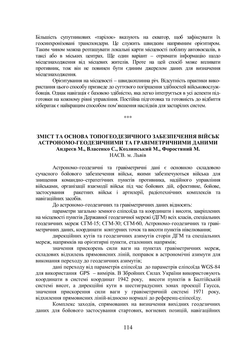 Зміст та основа топогеодезичного забезпечення військ астрономо-геодезичними та гравіметричними даними / М. Андреєв, С. Власенко, М. Козлинський, М. Форостяний // GEOFORUM’2018 : тези доповідей 23 Міжнародної науково-технічної конференції, присвяченої професійному святу працівників геології, геодезії і картографії України, 18–20 квітня 2018 року, Львів. — Львів : Видавництво Львівської політехніки, 2018. — С. 114–115.