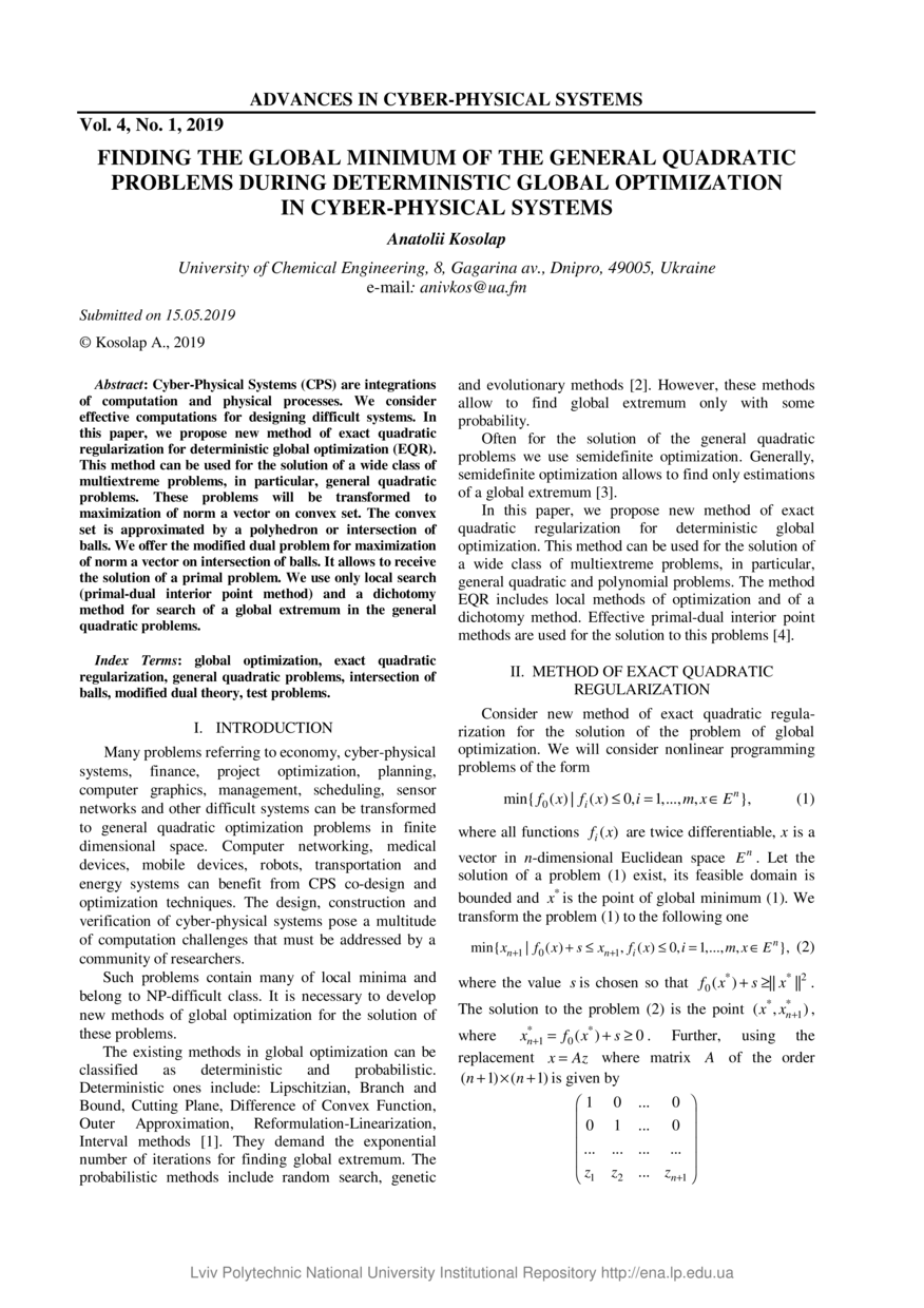 Kosolap A. Finding the global minimum of the general quadratic problems during deterministic global optimization in Cyber-Physical Systems / Anatolii Kosolap // Advances in Cyber-Physical Systems : scientific journal. — Львів : Lviv Politechnic Publishing House, 2019. — Vol 4. — No 1. — P. 31–35.