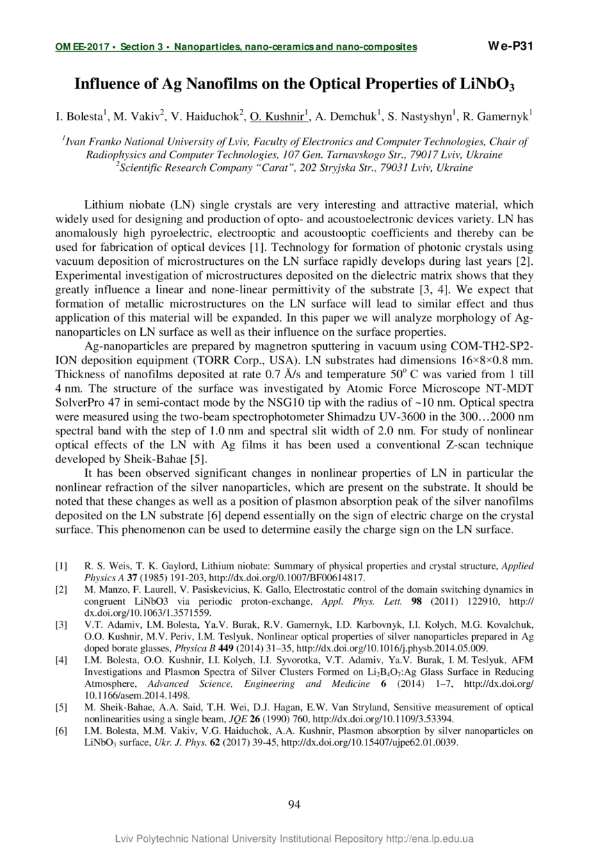 | dc.relation.referencesen | [1] R. S. Weis, T. K. Gaylord, Lithium niobate: Summary of physical properties and crystal structure, Applied Physics A 37 (1985) 191-203, http://dx.doi.org/0.1007/BF00614817. | |