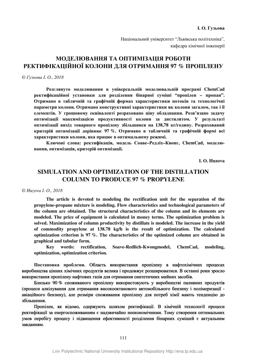 | dc.identifier.citation | Гузьова І. О. Моделювання та оптимізація роботи ректифікаційної колони для отримання 97 % пропілену / І. О. Гузьова // Chemistry, Technology and Application of Substances. — Lviv : Lviv Politechnic Publishing House, 2018. — Том 1. — № 2. — С. 111–118. | |