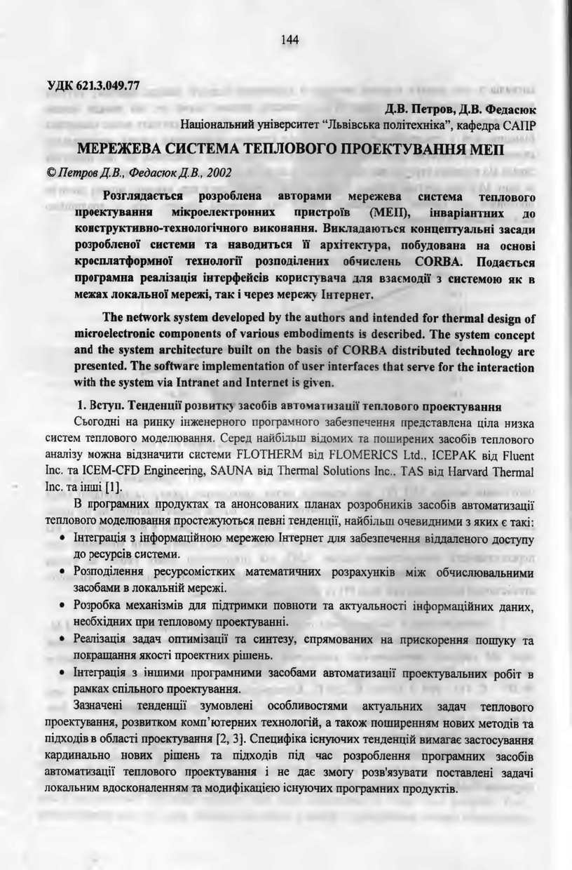 Петров Д. В. Мережева система теплового проектування МЕП / Д. В. Петров, Д. В. Федасюк // Вісник Національного університету “Львівська політехніка”. — Львів : Видавництво Національного університету “Львівська політехніка”, 2002. — № 443 : Радіоелектроніка та телекомунікації. — С. 144–149.