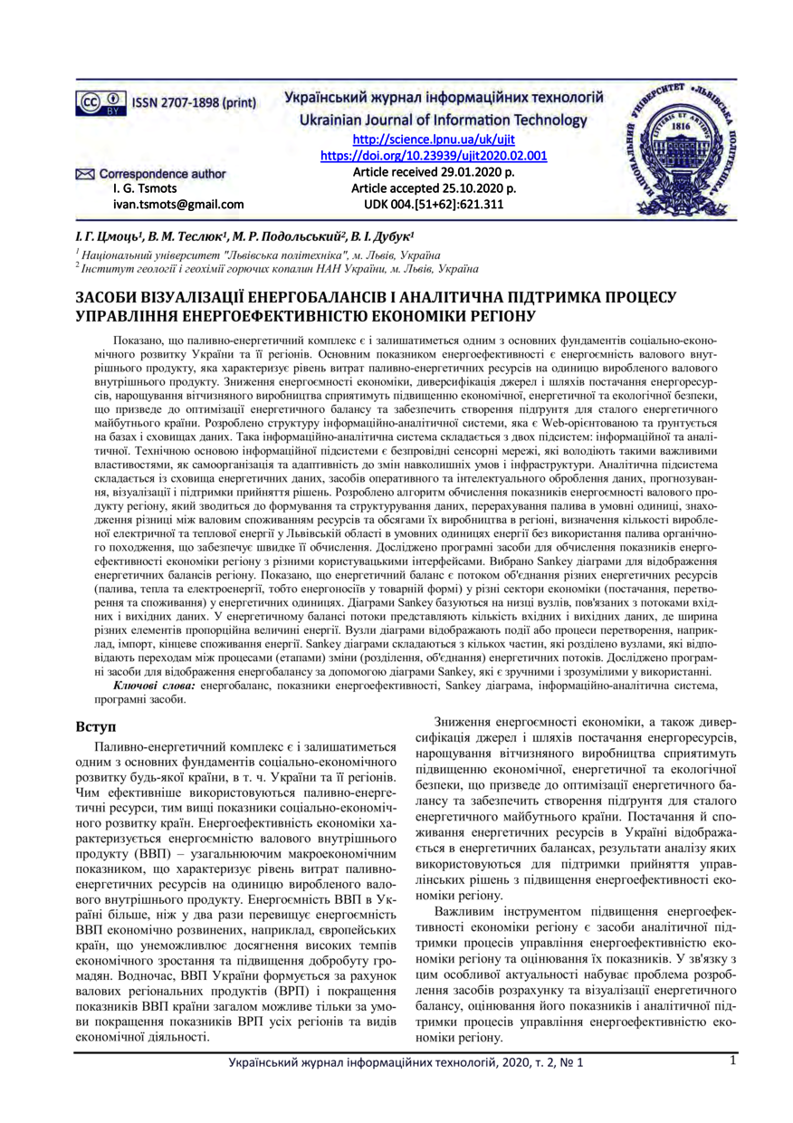 Засоби візуалізації енергобалансів і аналітична підтримка процесу управління енергоефективністю економіки регіону / І. Г. Цмоць, В. М. Теслюк, М. Р. Подольський, В. І. Дубук // Український журнал інформаційних технологій. — Львів : Видавництво Львівської політехніки, 2020. — Том 2. — № 1. — С. 1–7.