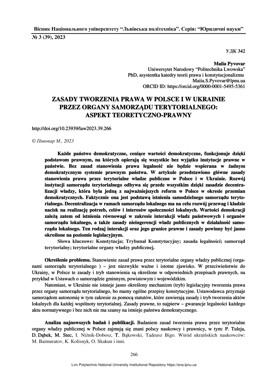| dc.identifier.citation | Pyvovar M. Zasady tworzenia prawa w Polsce i w Ukrainie przez organy samorządu terytorialnego: aspekt teoretyczno-prawny / Maiia Pyvovar // Вісник Національного університету “Львівська політехніка”. Серія: “Юридичні науки”. — Львів : Видавництво Львівської політехніки, 2023. — № 3 (39). — С. 266–272. | |