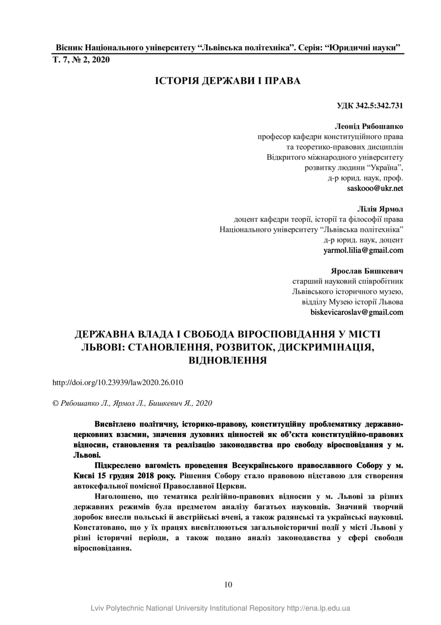 Рябошапко Л. Державна влада і свобода віросповідання у місті Львові: становлення, розвиток, дискримінація, відновлення / Леонід Рябошапко, Лілія Ярмол, Ярослав Бишкевич // Вісник Національного університету “Львівська політехніка”. Серія: Юридичні науки. — Львів : Видавництво Львівської політехніки, 2020. — Том 7. — № 2. — С. 10–18.