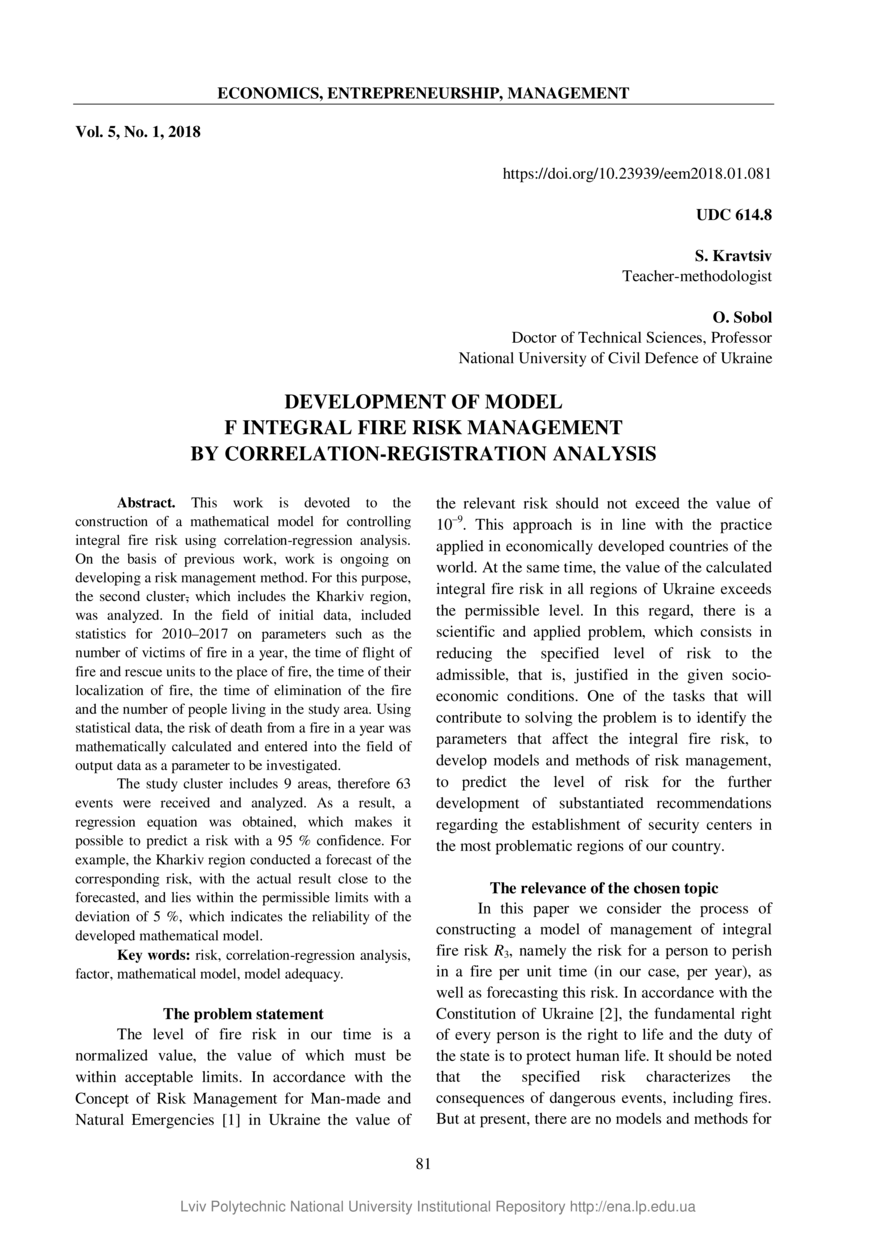 Kravtsiv S. Development of model f integral fire riskmanagement by correlation-registration analysis / S. Kravtsiv, O. Sobol // Economics, Entrepreneurship, Management. — Lviv : Lviv Politechnic Publishing House, 2018. — Vol 5. — No 1. — P. 81–86.