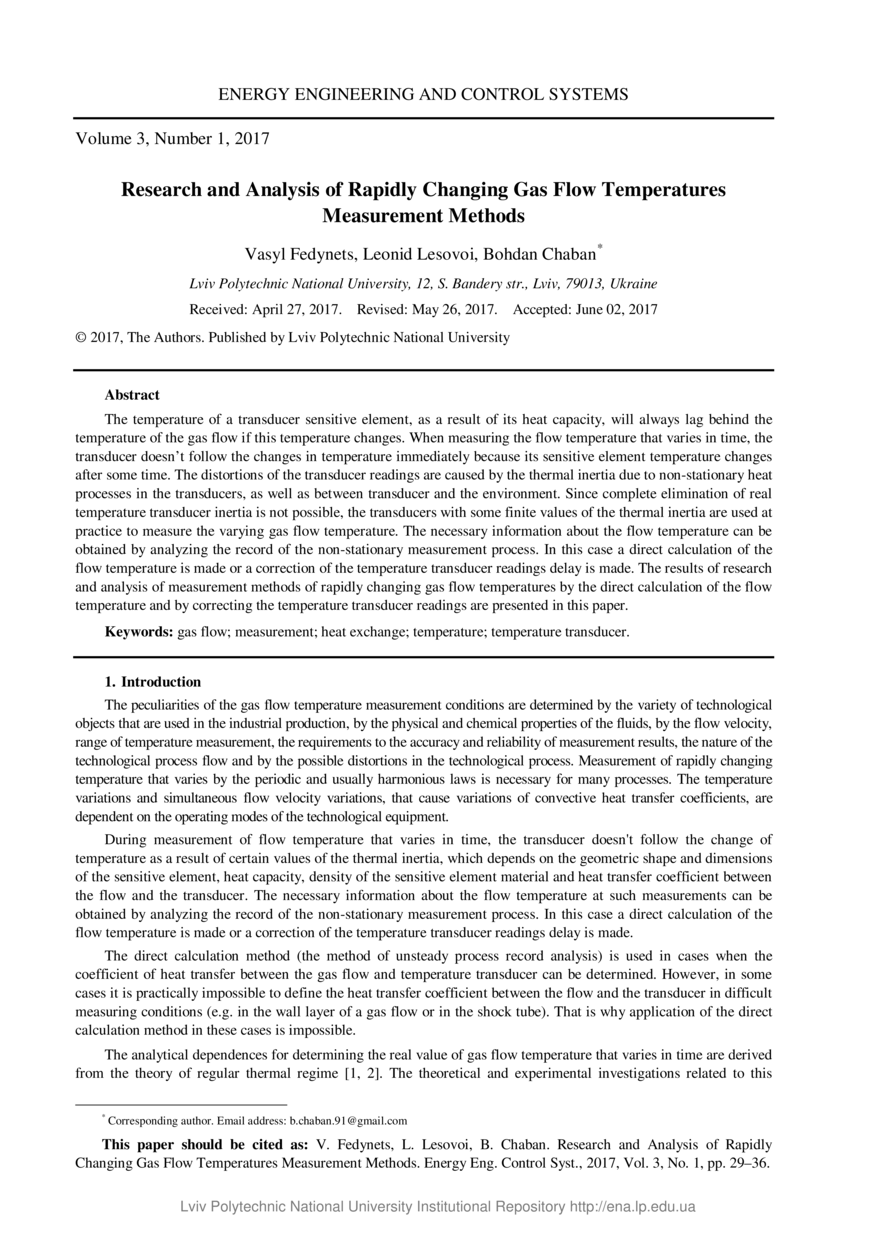 Fedynets V. Research and analysis of rapidly changing gas flow temperatures measurement methods / Vasyl Fedynets, Leonid Lesovoi, Bohdan Chaban // Energy Engineering and Control Systems. — Lviv : Printing Center of lviv Politechnic Publishing House, 2017. — Vol 3. — No 1. — P. 29–36.
