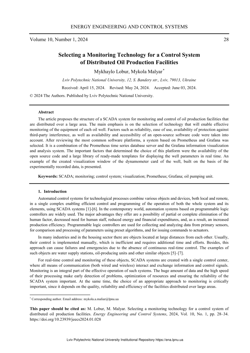 Lobur M. Selecting a Monitoring Technology for a Control System of Distributed Oil Production Facilities / Mykhaylo Lobur, Mykola Maliar // Energy Engineering and Control Systems. — Lviv : Lviv Politechnic Publishing House, 2024. — Vol 10. — No 1. — P. 28–34.