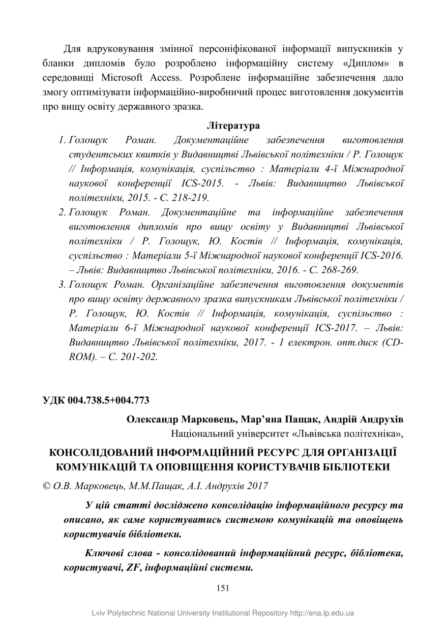 | dc.relation.referencesen | 5. Pashchak M. Informatyzatsiia ta avtomatyzatsiia protsesu obliku i kontroliu bibliotechnykh resursiv, M.Pashchak, O.Markovets, Informatsiia, komunikatsiia, suspilstvo: Materialy 3 Mizhnarodnoi naukovoi konferentsii ICS-2014, Lviv: Vydavnytstvo Lvivskoi politekhniky, 2014, P. 306-307. | |