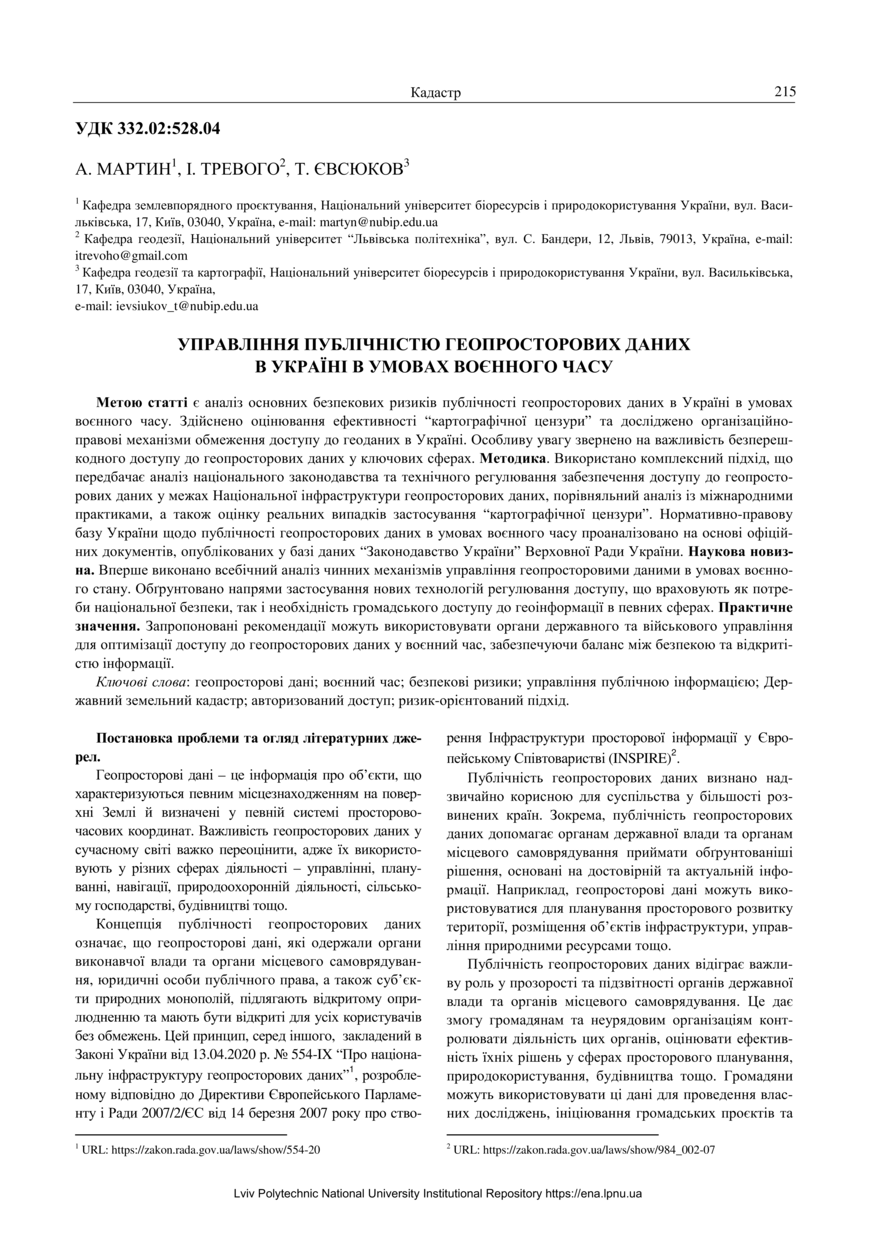 Мартин А. Управління публічністю геопросторових даних в Україні в умовах воєнного часу / А. Мартин, І. Тревого, Т. Євсюков // Сучасні досягнення геодезичної науки та виробництва. — Львів : Видавництво Львівської політехніки, 2024. — Том 1. — № 47. — С. 215–223.
