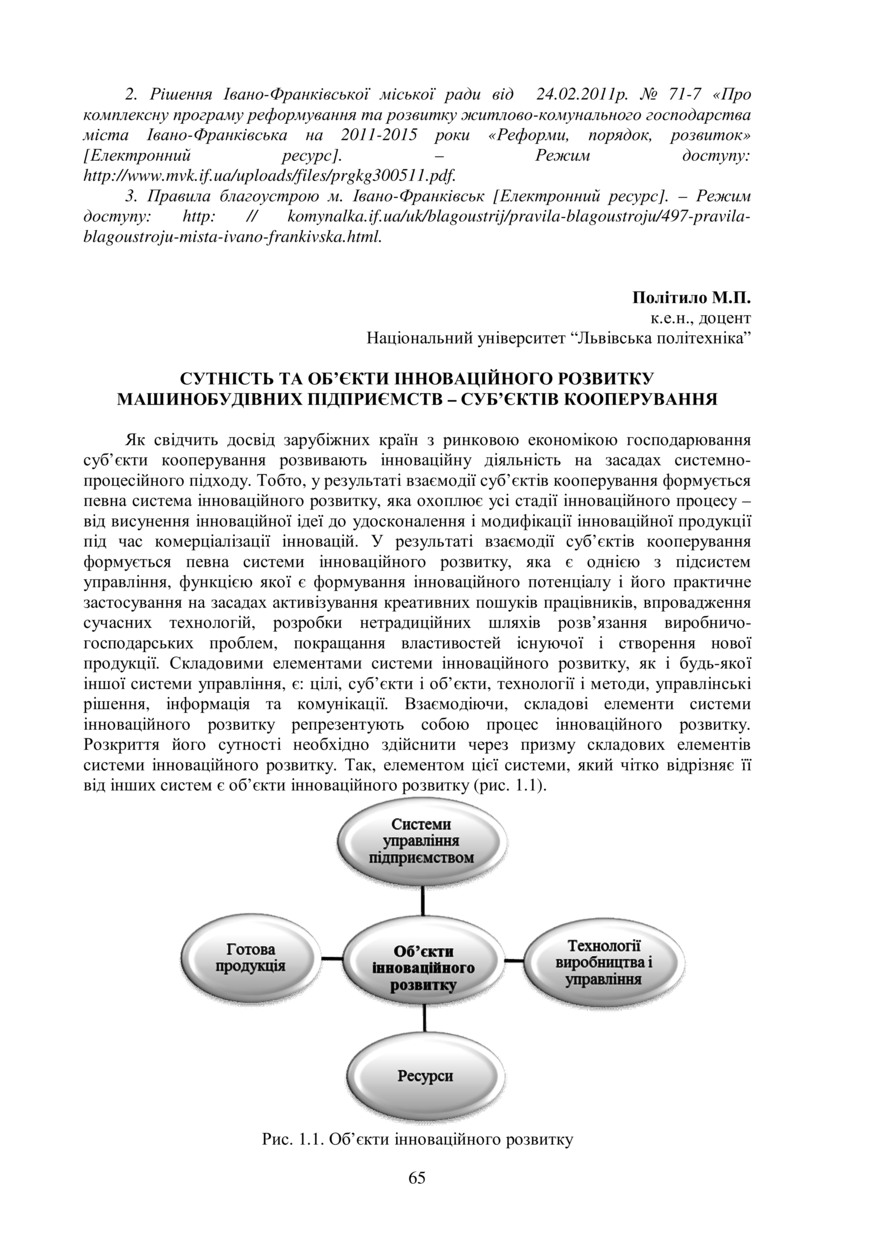 Політило М. П. Сутність та об’єкти інноваційного розвитку машинобудівних підприємств – суб’єктів кооперування / М. П. Політило // Управління економічними процесами на макро- і мікрорівні: проблеми та перспективи вирішення : матеріали ІІ Міжнародної науково-практичної інтернет-конференції молодих вчених, 14–15 квітня 2016 року, Львів. — Львів : Видавництво Львівської політехніки, 2016. — С. 65–67. — (Регіональне управління економікою на засадах інноваційного розвитку).