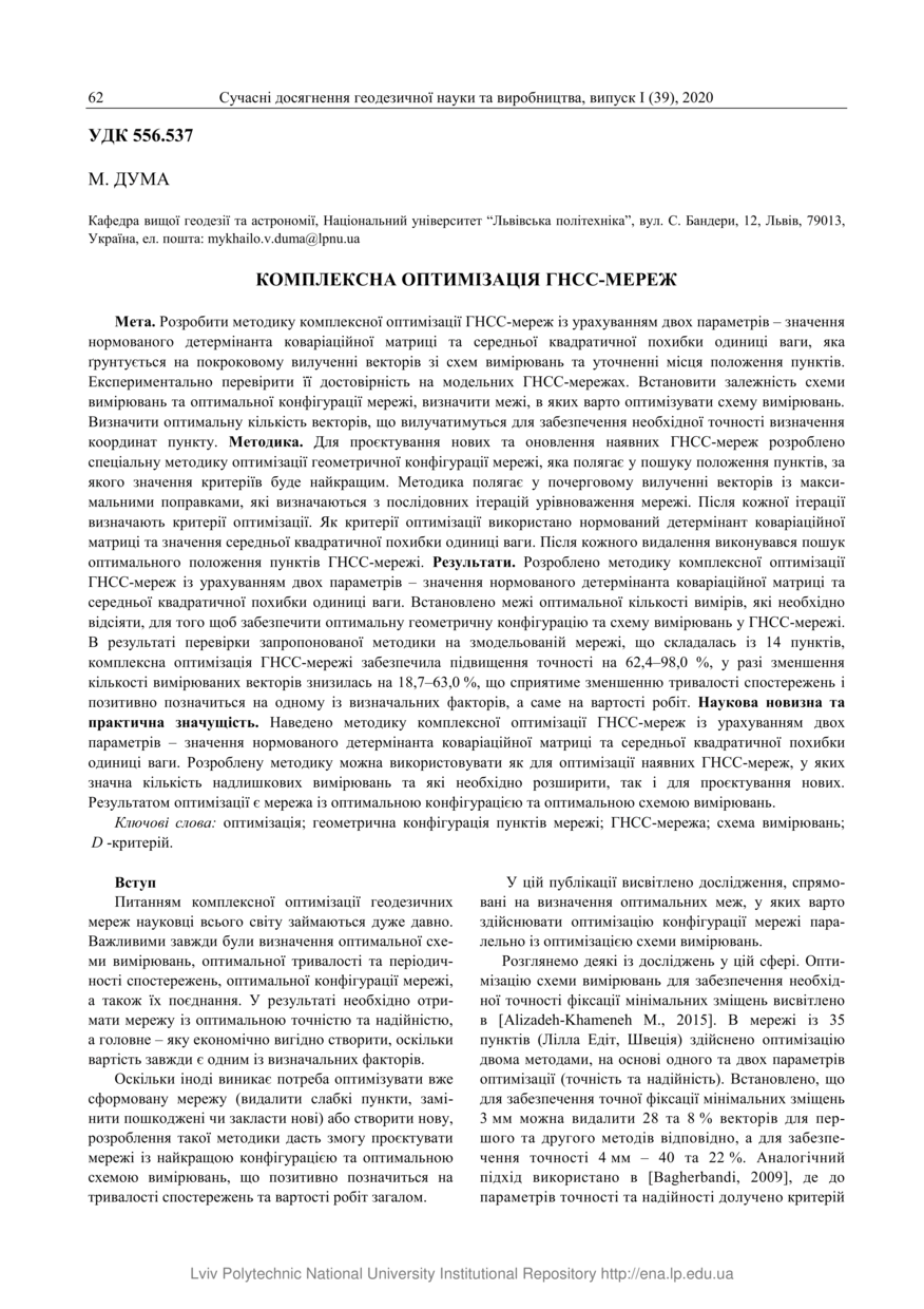 Дума М. Комплексна оптимізація ГНСС-мереж / М. Дума // Сучасні досягнення геодезичної науки та виробництва. — Львів : Видавництво Львівської політехніки, 2020. — Том 1(39). — С. 62–68.