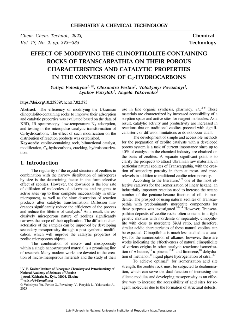 Effect of Modifying the Clinoptilolite-Containing Rocks of Transcarpathia on Their Porous Characteristics and Catalytic Properties in the Conversion of C6-Hydrocarbons / Yuliya Voloshyna, Olexandra Pertko, Volodymyr Povazhnyi, Lyubov Patrylak, Angela Yakovenko // Chemistry & Chemical Technology. — Lviv : Lviv Politechnic Publishing House, 2023. — Vol 17. — No 2. — P. 373–385.