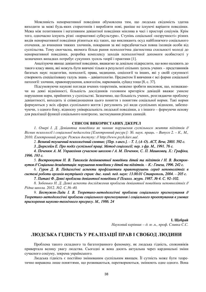 Щебрай І. Людська гідність у реалізації прав і свобод людини / І. Щебрай, С. С. Сливка // 76-та Студентська науково-технічна конференція. Секція права та психології : збірник тез доповідей, 15–29 жовтня 2018 року, Львів. — Львів : Видавництво Львівської політехніки, 2018. — С. 38–40. — (Теорії та філософії права).