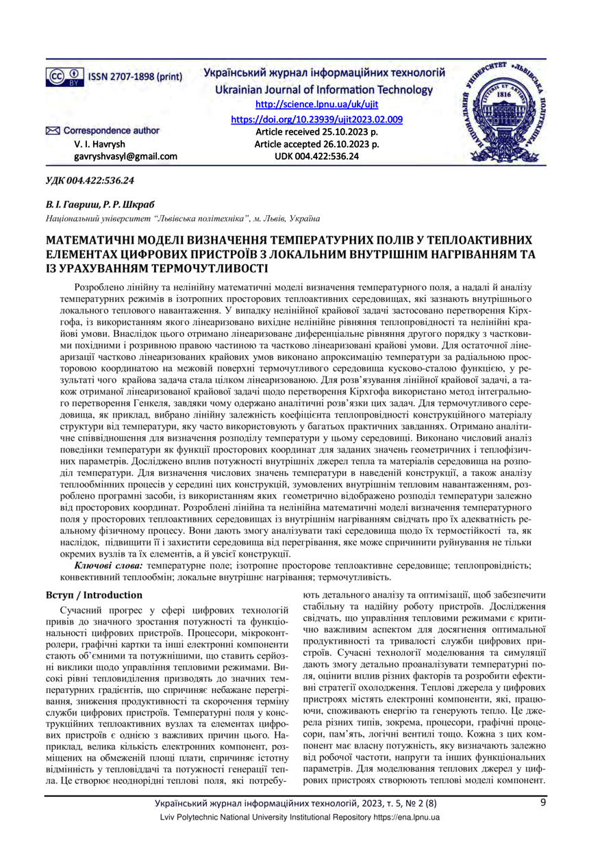 Гавриш В. І. Математичні моделі визначення температурних полів у теплоактивних елементах цифрових пристроїв з локальним внутрішнім нагріванням та із урахуванням термочутливості / В. І. Гавриш, Р. Р. Шкраб // Український журнал інформаційних технологій. — Львів : Видавництво Львівської політехніки, 2023. — Том 5. — № 2. — С. 9–16.