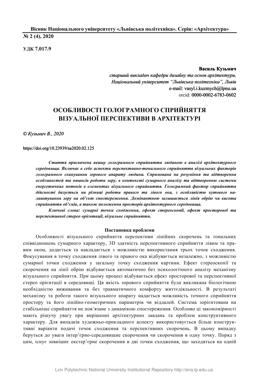 | dc.identifier.citationen | Kuzmych V. Features of holographic perception of visual perspective in architecture / Vasyl Kuzmych // Visnyk Natsionalnoho universytetu "Lvivska politekhnika". Serie: Arkhitektura. — Lviv : Lviv Politechnic Publishing House, 2020. — Vol 2. — No 4. — P. 125–131. | |