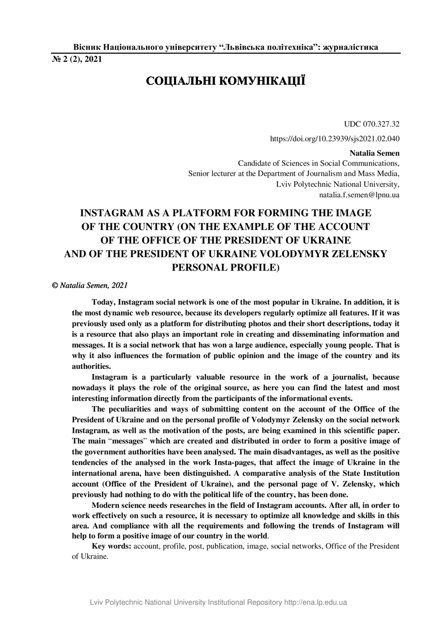 Semen N. Instagram as a platform for forming the image of the country (on the example of the account of the Office of the president of Ukraine and of the president of Ukraine Volodymyr Zelensky personal profile) / Natalia Semen // Bulletin of Lviv Polytechnic National University : journalism. — Lviv : Lviv Politechnic Publishing House, 2021. — Vol 2 (2). — P. 40–44.