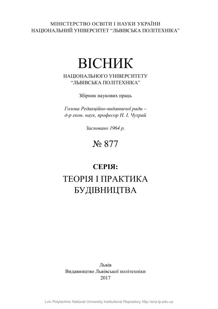 Титульна сторінка // Вісник національного університету “Львівська політехніка”. Серія: Теорія і практика будівництва. — Львів : Видавництво Львівської політехніки, 2017. — № 877. — С. 1–2.