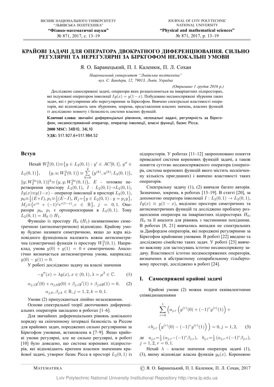 | dc.identifier.citation | Баранецький Я. О. Крайові задачі для оператора двократного диференціювання. Сильно регулярні та нерегулярні за Біркгофом нелокальні умови / Я. О. Баранецький, П. І. Каленюк, П. Л. Сохан // Вісник Національного університету «Львівська політехніка». Серія: Фізико-математичні науки. — Львів : Видавництво Львівської політехніки, 2017. — № 871. — С. 13–19. | |