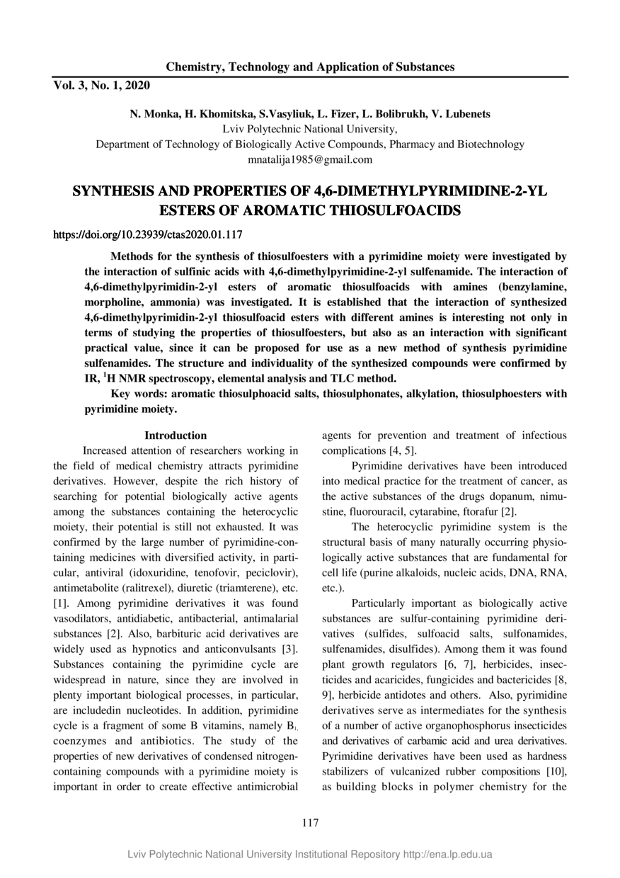 | dc.relation.referencesen | 20. Monka, N. Ia., Baranovych, D. B., Shyian, H. B., Khomitska, H. M., Lubenets, V. I. (2019). Syntez ta vlastyvosti 4-amino-2-metylpirymidyn-5-il-metylovykh esteriv aromatychnykh tiosulfokyslot. Chemistry, Technology and Application of Substances, 2(2), 122–128. | |