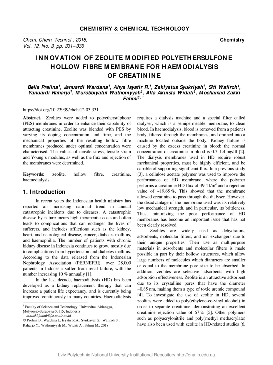 Innovation of zeolite modified polyethersulfone hollow fibre membrane for haemodialysis of creatinine / Bella Prelina, Januardi Wardana, Ahya Isyatir R., Zakiyatus Syukriyah, Siti Wafiroh, Yanuardi Raharjo, Murobbiyatul Wathoniyyah, Alfa Akuista Widati, Mochamad Zakki Fahmi // Chemistry & Chemical Technology. — Lviv : Lviv Politechnic Publishing House, 2018. — Vol 12. — No 3. — P. 331–336.