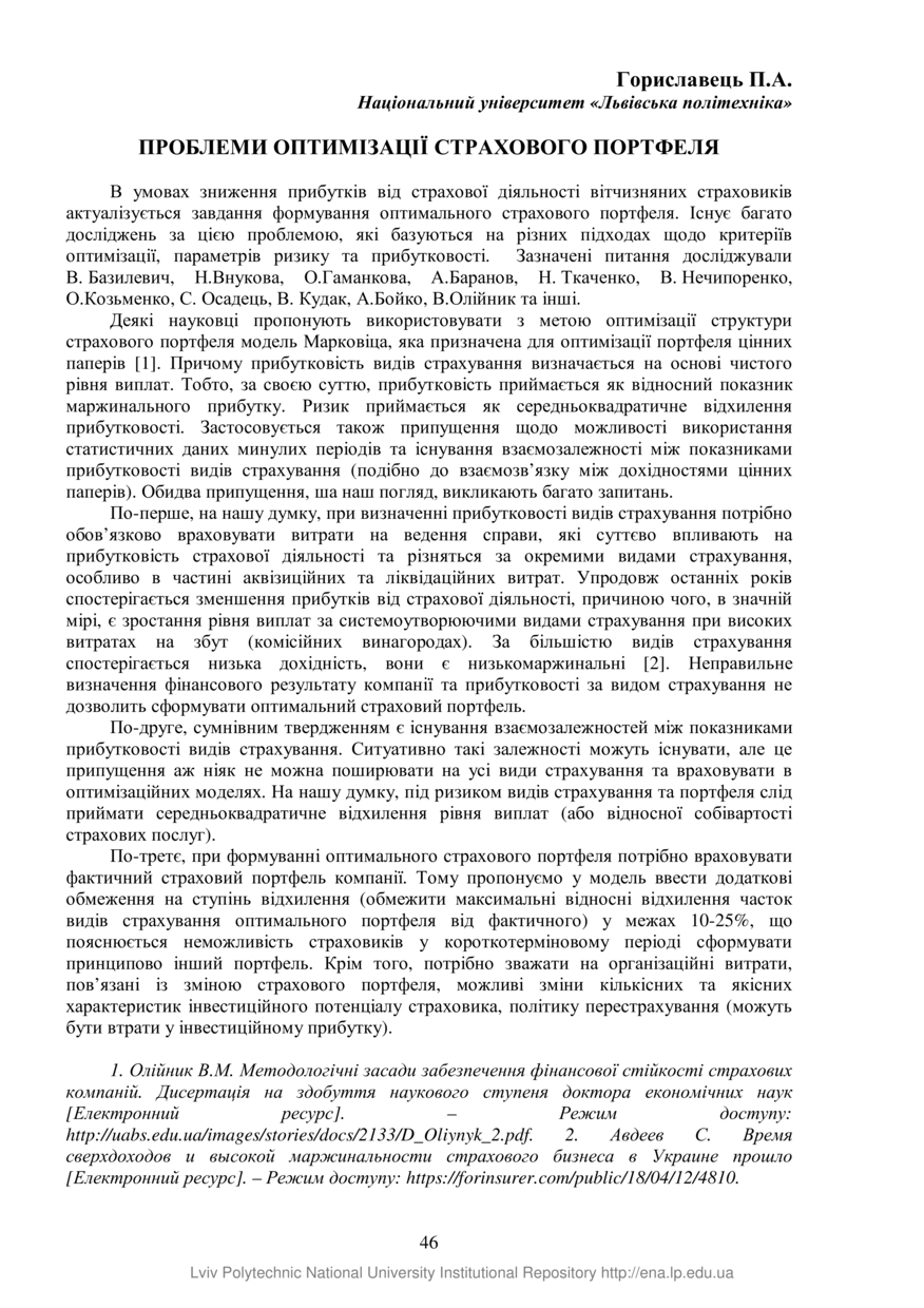 Гориславець П. А. Проблеми оптимізації страхового портфеля / П. А. Гориславець // Проблеми та перспективи розвитку економіки і підприємництва та комп’ютерних технологій в Україні : збірник тез доповідей ХIV Науково-практичної конференції, 17-20 квітня 2018 року. — Львів : Видавництво Львівської політехніки, 2018. — С. 46. — (Розвиток фінансів, обліку та аналізу в умовах глобалізаційних трансформацій).