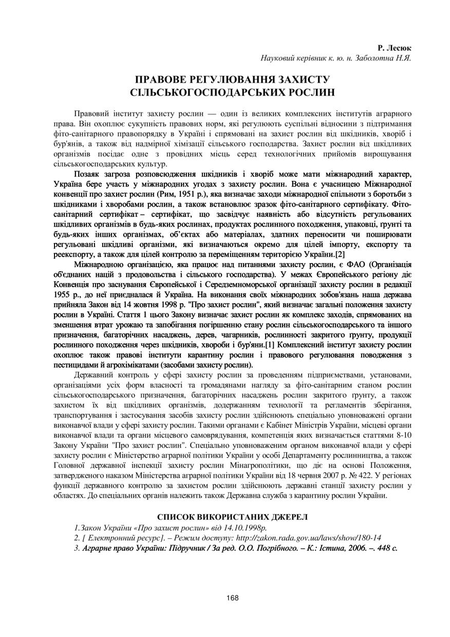 Лесюк Р. Правове регулювання захисту сільськогосподарських рослин / Р. Лесюк, Н. Я. Заболотна // 76-та Студентська науково-технічна конференція. Секція права та психології : збірник тез доповідей, 15–29 жовтня 2018 року, Львів. — Львів : Видавництво Львівської політехніки, 2018. — С. 168. — (Цивільногого права та процесу).
