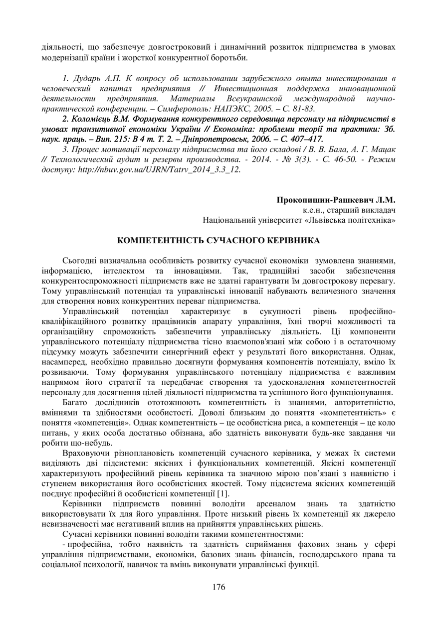 | dc.relation.references | 1.Швець І. Компетентність управлінського персоналу: формування, розвиток та ефективність використання / І.Швець, С. Позднякова// Україна: аспекти праці. – 2011. - № 1. С.31-36. | |