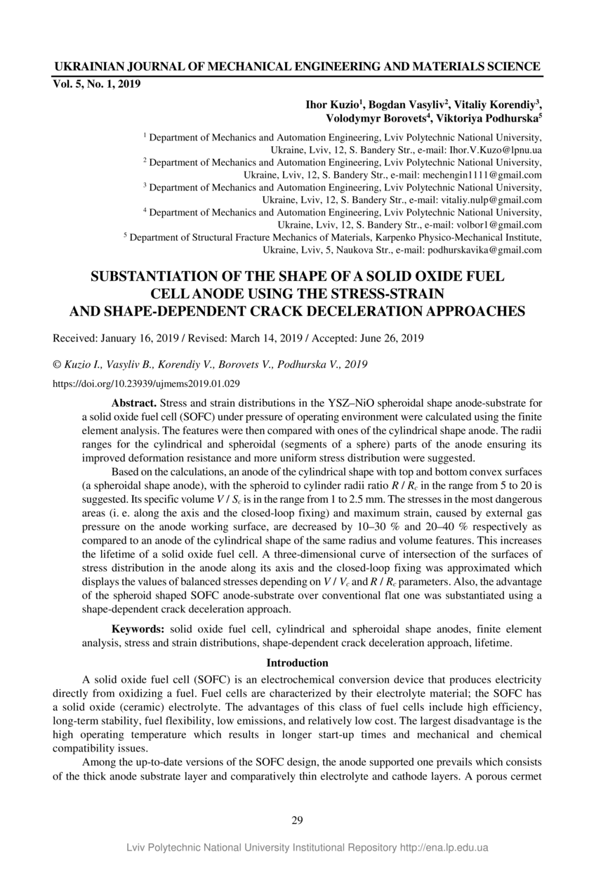 | dc.identifier.citationen | Substantiation of the shape of a solid oxide fuel cell anode using the stress-strain and shape-dependent crack deceleration approaches / Igor Kuzio, Bogdan Vasyliv, Vitaliy Korendiy, Volodymyr Borovets, Viktoriya Podhurska // Ukrainian Journal of Mechanical Engineering and Materials Science. — Lviv : Lviv Politechnic Publishing House, 2019. — Vol 5. — No 1. — P. 29–38. | |