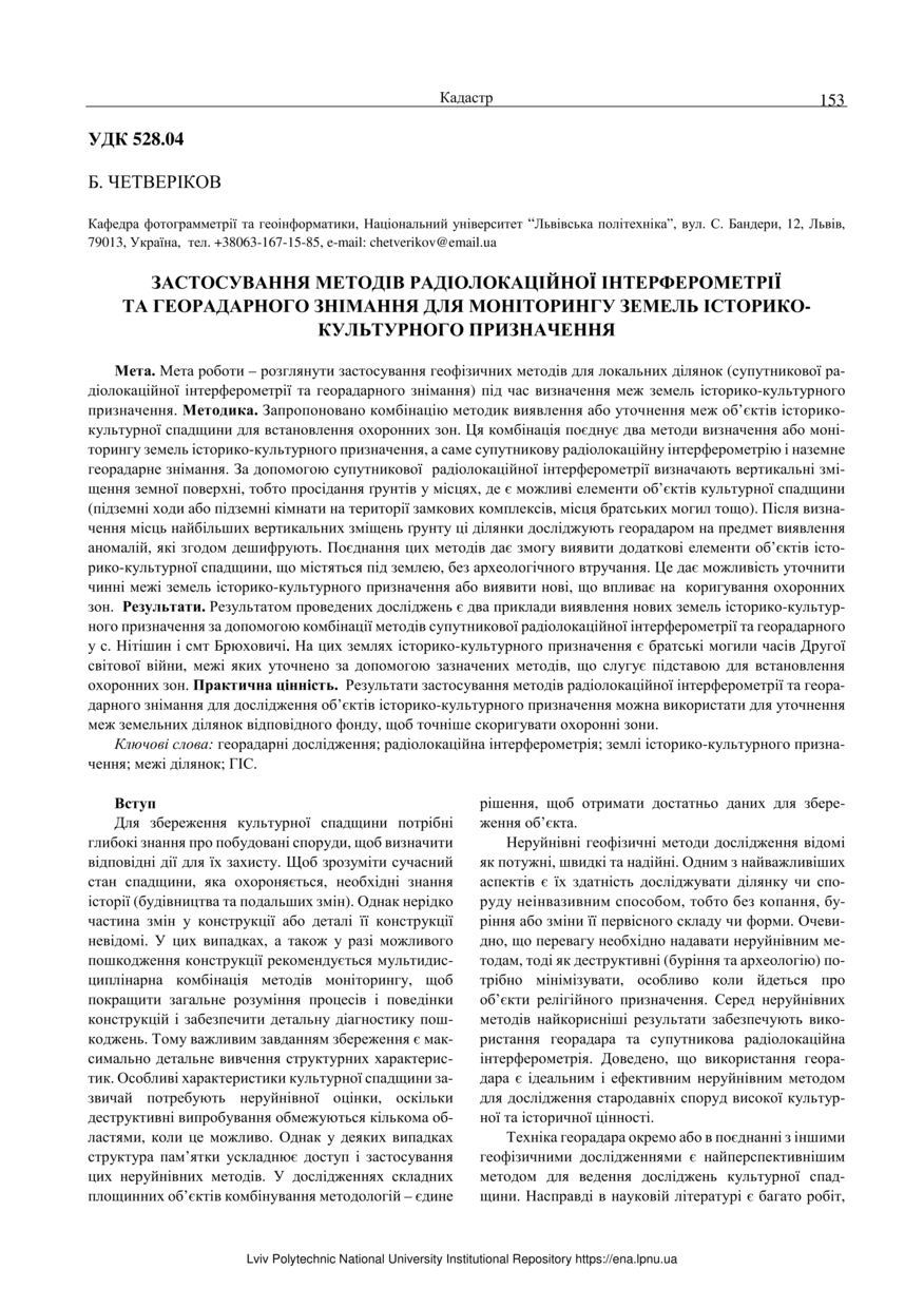 | dc.description.abstract | Мета роботи – розглянути застосування геофізичних методів для локальних ділянок (супутникової радіолокаційної інтерферометрії та георадарного знімання) під час визначення меж земель історико-культурного призначення. Методика. Запропоновано комбінацію методик виявлення або уточнення меж об’єктів історикокультурної спадщини для встановлення охоронних зон. Ця комбінація поєднує два методи визначення або моніторингу земель історико-культурного призначення, а саме супутникову радіолокаційну інтерферометріюі наземне георадарне знімання. За допомогою супутникової радіолокаційної інтерферометрії визначають вертикальні зміщення земної поверхні, тобто просідання ґрунтів у місцях, де є можливі елементи об’єктів культурної спадщини (підземні ходи або підземні кімнати на території замкових комплексів, місця братських могил тощо). Після визначення місць найбільших вертикальних зміщень ґрунту ці ділянки досліджують георадаром на предмет виявлення аномалій, які згодом дешифрують. Поєднання цих методів дає змогу виявити додаткові елементи об’єктів історико-культурної спадщини, що містяться під землею, без археологічного втручання. Це дає можливість уточнити чинні межі земель історико-культурного призначення або виявити нові, що впливає на коригування охоронних зон. Результати. Результатом проведених досліджень є два приклади виявлення нових земель історико-культурного призначення за допомогоюкомбінації методів супутникової радіолокаційної інтерферометрії та георадарного у с. Нітішин і смт Брюховичі. На цих землях історико-культурного призначення є братські могили часів Другої світової війни, межі яких уточнено за допомогою зазначених методів, що слугує підставою для встановлення охоронних зон. Практична цінність. Результати застосування методів радіолокаційної інтерферометрії та георадарного знімання для дослідження об’єктів історико-культурного призначення можна використати для уточнення меж земельних ділянок відповідного фонду, щоб точніше скоригувати охоронні зони. | |