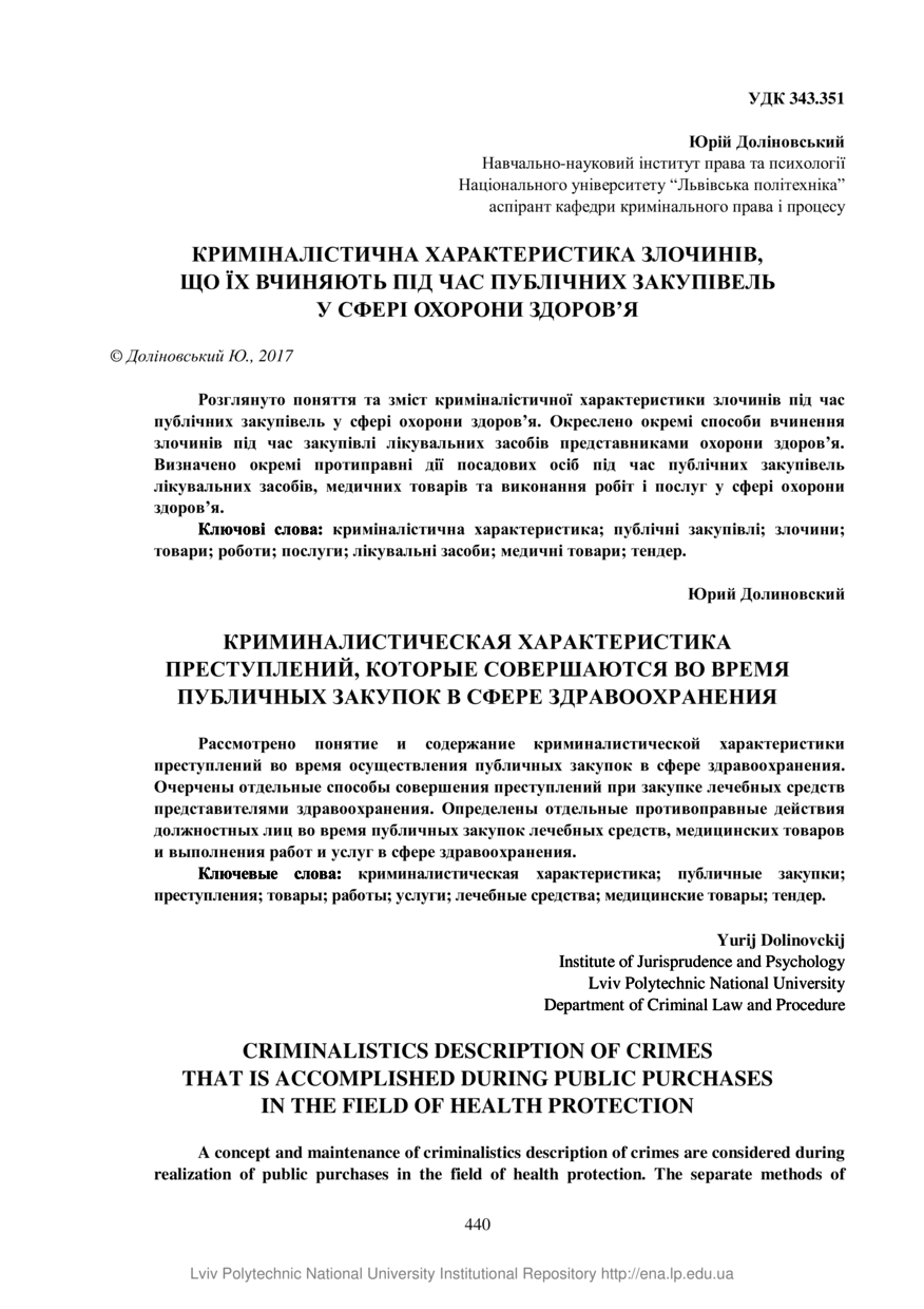 | dc.title.alternative | Criminalistics description of crimes that is accomplished during public purchases in the field of health protection | |