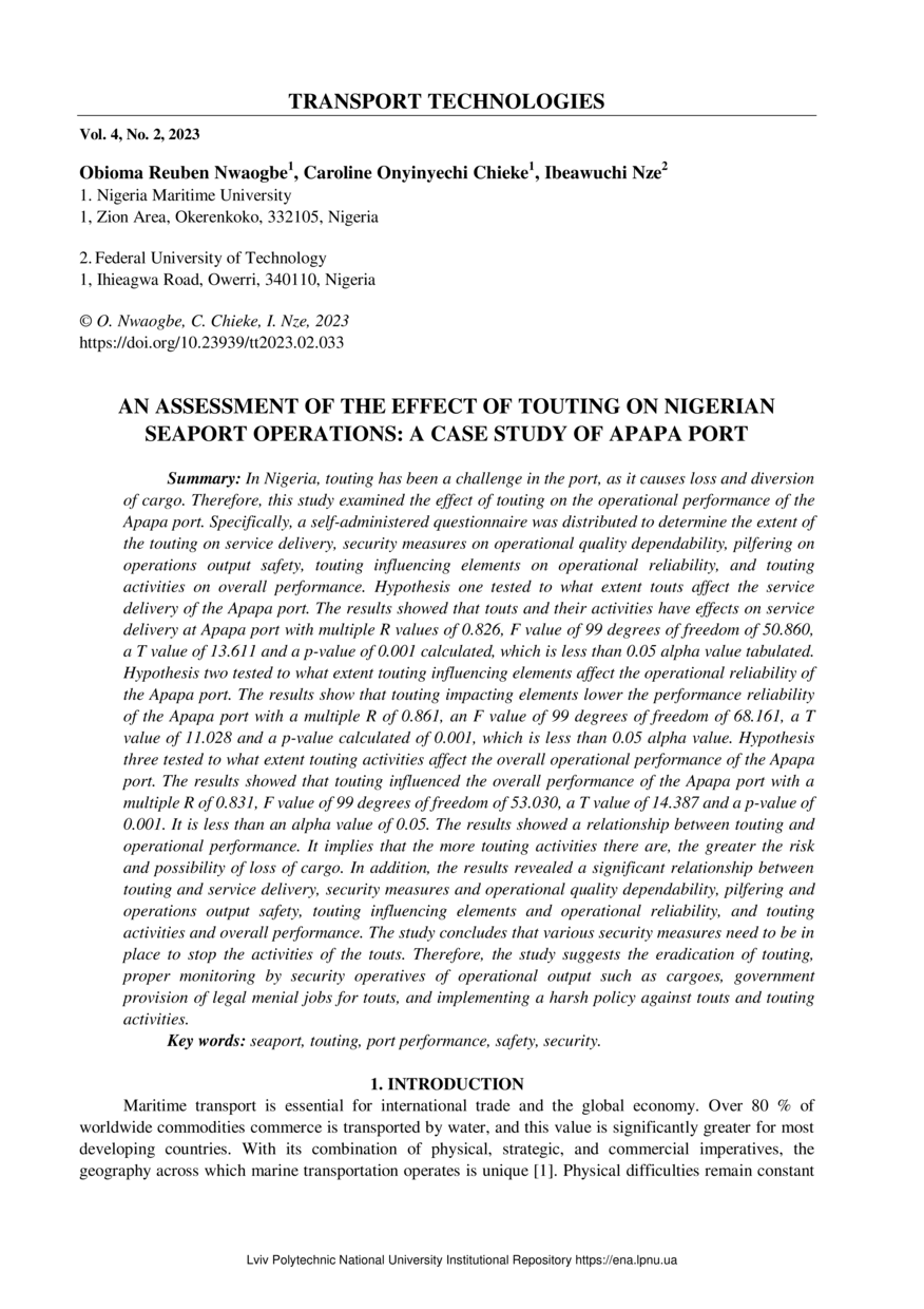 Nwaogbe O. R. An assessment of the effect of touting on Nigerian seaport operations: a case study of Apapa port / Obioma Reuben Nwaogbe, Caroline Onyinyechi Chieke, Ibeawuchi Nze // Transport Technologies. — Lviv : Lviv Politechnic Publishing House, 2023. — Vol 4. — No 2. — P. 33–43.