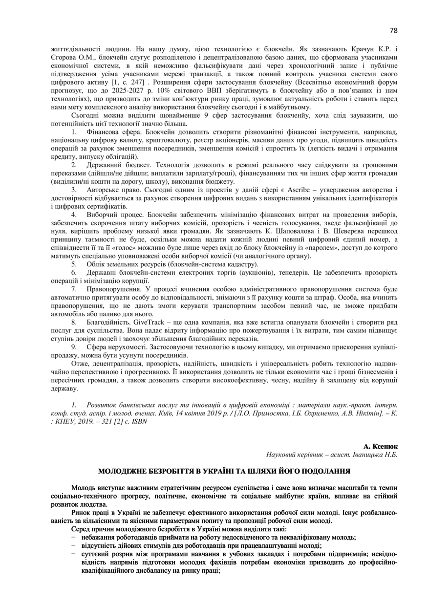 Ксенюк А. Молодіжне безробіття в Україні та шляхи його подолання / А. Ксенюк, Н. Б. Іваницька // 77-ма Студентська науково-технічна конференція. Секція "Публічне управління та адміністрування" : збірник тез доповідей, 7 листопада 2019 року, Львів. — Львів : Видавництво Львівської політехніки, 2019. — С. 78–79. — (Економічна теорія та історія розвитку економіки).